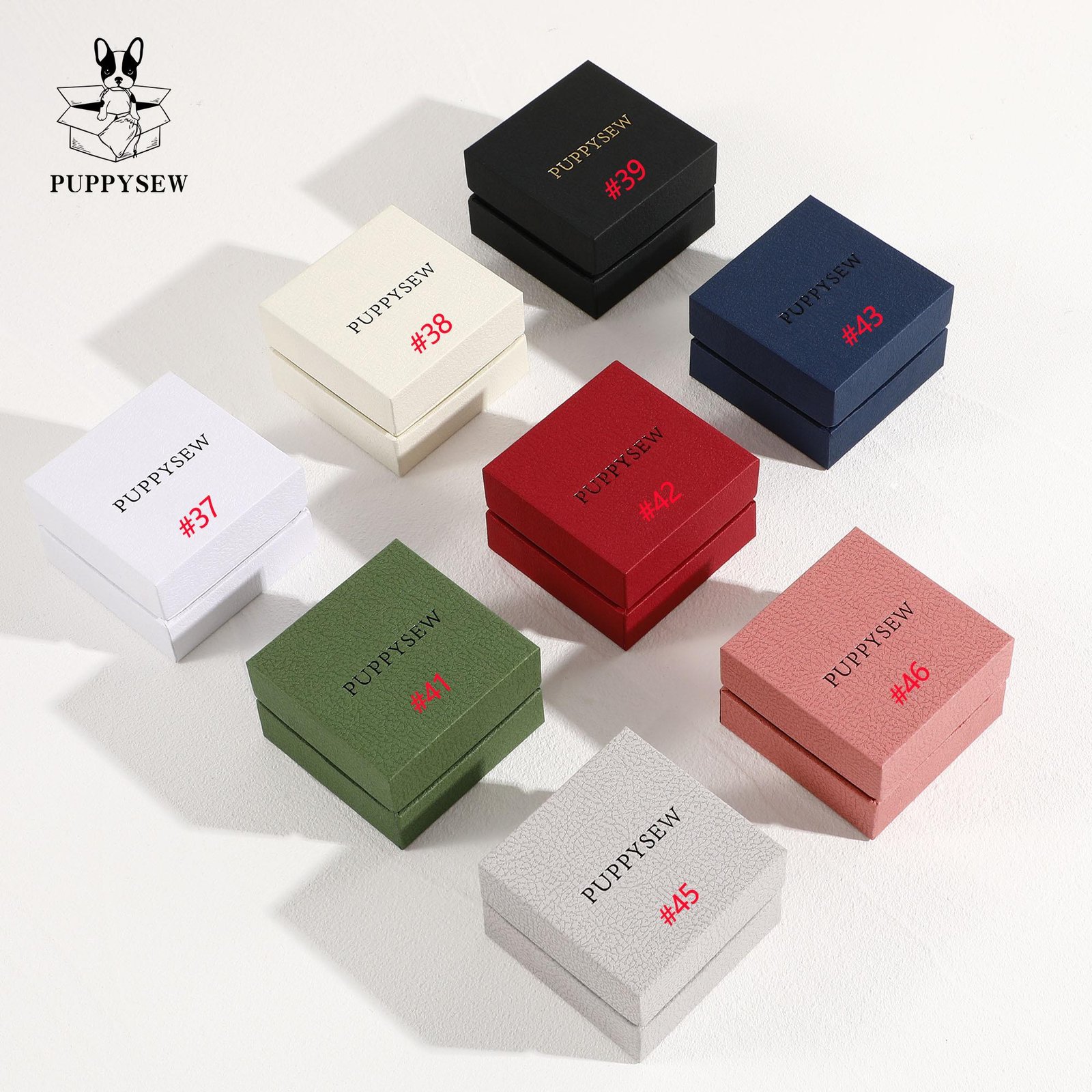 #38 Beige Box, #39 Black Box, #41 Green Box, #42 Red Box, #43 Blue Box, #45 Grey Box, #46 Pink Box, #37 White box